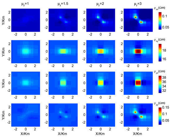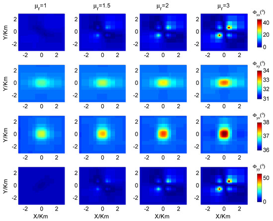 The data in Figure 9 demonstrate that the apparent resistivities of the xx-, xy-, yx-, and yy-modes increase as the relative permeability increases, with the first to fourth rows corresponding to these modes, respectively. These findings highlight the significant influence of high relative permeability on apparent resistivities. The results in Figure 10 show that the relative permeability also has a significant effect on the phases.