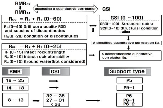 - Zhang, Q.; Huang, X.; Zhu, H.; Li, J. Quantitative assessments of the correlations between rock mass rating (RMR) and geological strength index (GSI). Tunn. Undergr. Space Technol. 2019, 83, 73–81. [Google Scholar] [CrossRef]