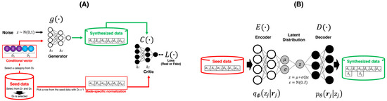 Like the other GAN algorithms, the CTGAN architecture primarily comprises two modules: generator and discriminator (Figure 1A). Here, denotes the generator responsible for producing fake data, whereas C(∙) represents the discriminator tasked with distinguishing between fake and real inputted data. The loss function is denoted by (∙), and z signifies the noise generated from a standard normal distribution (N(0,1)). Before being fed into the critic module, the seed data undergo normalization using mode-specific normalization methods.