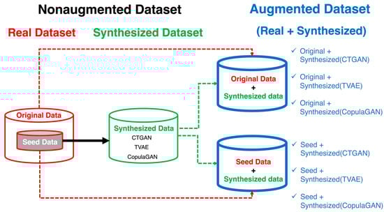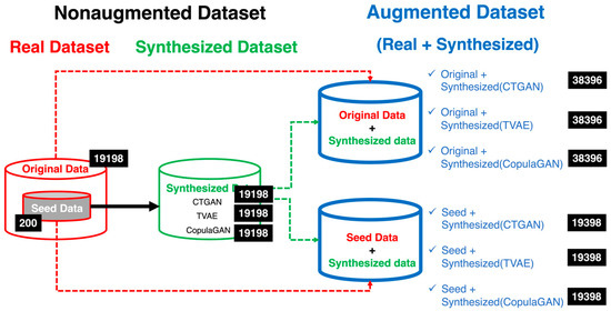 Furthermore, the predictive performance of the synthesized data approximated or surpassed that of the augmented data. The synthesized data generated by CTGAN obtained the highest predictive performance, surpassing that of the augmented data (“Real (seed) + Synthesized (CTGAN)” and “Real (original) + Synthesized (CTGAN)”). A similar trend was observed in datasets related to CopulaGAN and partially in those related to TVAE, indicating that synthesized data can effectively emulate real data as a “clone” of the original dataset. In particular, GAN-based synthesizers (CTGAN and CopulaGAN) were superior to the TVAE synthesizer. The distinctiveness of the network architecture between the GAN-based and VAE-based synthesizers might have caused differences in their predictive performance. The mode-specific normalization module is a unique function in GAN-based synthesizers. It might function effectively when the synthesizers train the data. Given that it adjusted complicated data composed of conditional and continuous columns to an appropriate kernel function using a variational Gaussian mixture model (VGM), ideal data might have been generated based on a probabilistic distribution. However, as this is one assumption, we must investigate this phenomenon further in the following research. Data cloning techniques using synthetic data generated using DGNNs have proven successful in computer vision tasks such as image, movie, and audio recognition [46,47,48,49].