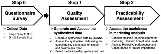 We validated the effectiveness of the synthesized data following two steps (Figure 3). First, we assessed the quality of the synthesized data. Second, we evaluated the data augmentation practicability using the assessed synthesized data from the previous step. Outcome prediction and feature evaluation play crucial roles in marketing analysis, similar to the application of machine learning techniques aside from marketing research. Outcome prediction is applied to predict preferred brands, while feature evaluation is used to identify influential variables toward outcomes. The latter analysis is particularly referred to as the key driver analysis in the marketing analysis, playing a crucial role in marketing decision-making [37]. Thus, assessing the predictive performance and the feature importance is necessary in validating the usefulness of data augmentation with the synthesized data.