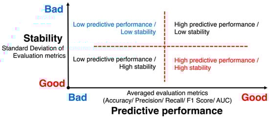 Regarding the predictive performance, we calculated the averages of the evaluation metrics such as accuracy, precision, recall, F1 scores, and area under the curve (AUC) in each machine learning algorithm using each datum and its standard deviation. The average values of these evaluation metrics represent the predictive performance when using the data, while the standard deviation values depict the predictive performance stability. The useful data for the predictive analysis were easily assessed by organizing these values into a two-dimensional (2D) map and plotting each datum in it (Figure 4). The horizontal axis represents the predictive performance, which is the average value of the evaluation metrics, whereas the vertical axis denotes the stability concerning the evaluation metrics when conducting a predictive analysis, which comprises the standard deviation values for the evaluation metrics. These high average and low standard deviation values show the data qualities without depending on the abilities of machine learning algorithms under uniform conditions relative to the hyperparameters of the machine learning algorithms. This map shows that the data with the best predictive performance and the highest stability are the most useful data for prediction tasks in marketing analysis, regardless of the type of machine learning algorithm.