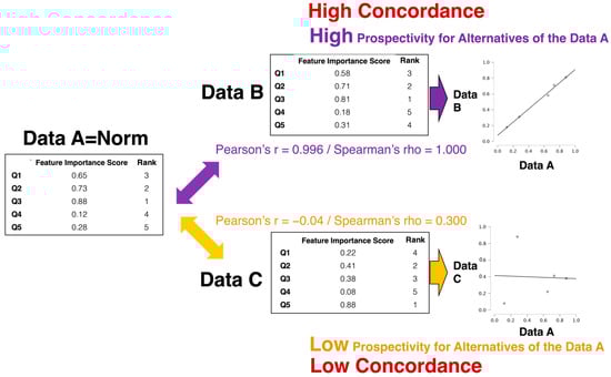 In relation to the degree of concordance of the feature importance scores (Figure 5), the original data, which are the benchmark data, corresponded with Data A, while the other data, such as the seed and synthesized data, corresponded with Data B and C. We calculated the correlation coefficients (Pearson’s r and Spearman’s rho) between the original and other data based on the feature importance scores computed in each machine learning algorithm. These correlation coefficients imply the degree of concordance between the original and other data, validating whether or not the other data offer possibilities of alternatives to the original data when predicting outcomes and assessing the influential features for outcomes. While the data with higher correlation coefficient values might be a prospective alternative to the original data, those with low correlation coefficient values might be less desirable in terms of alternatives to the original data.