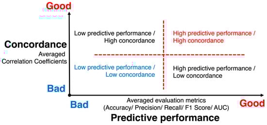 Conceptual predictive performance vs. concordance of the feature importance score map.