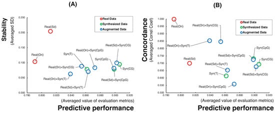 The actual predictive performance vs. stability map (Figure 9A) was created based on the columns “Averaged value of evaluation metrics” and “SD of AVEM” in Table 3. The predictive performance vs. concordance of the feature importance score map (Figure 9B) was created based on “Averaged value of evaluation metrics” in Table 2 and “Averaged correlation coefficients” in Table 4. Regarding the averaged correlation coefficient values of the original datasets in Table 4 and Figure 9B, we provided them with 1.00 because we defined them as the benchmark value. From the results of both maps, both augmented and synthesized datasets had higher predictive performance than real datasets, regardless of the data scale. The result of the actual predictive performance vs. stability map (Figure 9A) showed that the augmented and synthesized datasets achieved higher predictive performances than the two real datasets (the original and seed datasets), relatively lower fluctuation than the original dataset, and much lower fluctuation than the seed dataset. Two augmented datasets (“Real (seed) + Synthesized (CTGAN)” and “Real (seed) + Synthesized (CopulaGAN)”) and two synthesized datasets (“Synthesized (CTGAN)” and “Synthesized (CopulaGAN)”) were placed in desirable positions because they yielded high predictive performance and universality regardless of machine learning algorithms. However, the augmented and synthesized datasets had the same or relatively low averaged correlation coefficient values as the seed datasets, unlike the predictive performance. Although the augmented datasets related to the original dataset (Real (original) + Synthesized (CTGAN), Real (original) + Synthesized (TVAE)), which yielded averaged correlation coefficients of approximately 0.850, achieved relatively higher concordance with the original dataset, the values are presumed to be the contribution of the original dataset, not the synthesized dataset generated using each DGNN. Among the augmented data based on the seed data, the augmented data composed of both the seed and synthesized data generated by the CopulaGAN achieved the highest predictive performance and relatively higher concordance.
