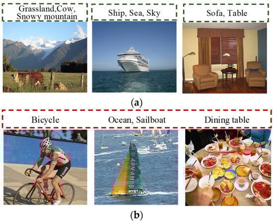 Another type of dataset suitable for deep learning multi-label tasks includes Pascal VOC2007 [] and MS COCO2014 []. The Pascal VOC dataset is primarily used for object detection, image classification, and semantic segmentation tasks. It contains a total of 9963 images, with 5011 images in the training and validation sets and 4952 images in the test set, covering 20 label categories. In addition, MS COCO is a large-scale computer vision dataset used for tasks such as object recognition, object detection, and image segmentation. It includes over 123,000 annotated images across 80 different object categories, with an average of 2.9 label categories per image. This dataset encompasses a wide range of everyday objects, such as people, animals, vehicles, and food.