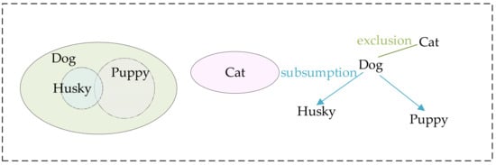 Later, Deng et al. [] proposed a new representation structure based on WordNet, called HEX graph, which simultaneously characterizes three types of relationships between labels: exclusion, co-occurrence, and hierarchy. As shown in Figure 3, the labels “Dog” and “Cat” indicate a mutually exclusive relationship, meaning that these two categories cannot simultaneously apply to the same object instance. The overlapping area between the labels “Husky” and “Puppy” represents a co-occurrence relationship, indicating that a single “Puppy” can be classified as both a “Husky” and a “Dog”. Additionally, the label “Dog”, as a parent class of “Husky” and “Puppy”, illustrates a hierarchical relationship, where one label encompasses another. This work was the first to jointly model label hierarchy and label exclusion relationships. Ding et al. [] further extended the HEX graph to allow for the introduction of soft or probabilistic relationships between labels. Additionally, Hu et al. [] also extracted structured label relationships by parsing relationships in WordNet, including positive and negative label correlations, and then generated a label relationship graph to enhance the inference process of neural networks.