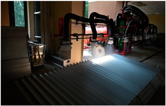 Intensive farming techniques require the use of plant protection chemicals to prevent the spread of pests, diseases, and weeds that reduce crop yields. These chemicals can also be toxic to humans and animals; therefore, they should be applied only when necessary [1,2,3,4,5], particularly because their residues can persist in various parts of protected plants for long periods of time. Crop-spraying operations should involve equipment that is in good technical condition, and chemicals should be applied in minimal effective doses [6,7,8]. To achieve this goal, the applied liquid should be uniformly distributed over the target crops [9,10,11]. A uniform spray distribution is also one of the requirements of sustainable agriculture, which aims to minimize the environmental impact of farming operations through the rational use of natural resources and agricultural inputs without compromising farming profits [12,13,14]. The position of spray nozzles above the crop stand should be optimized to achieve the above goal and to minimize spray drift [15,16]. In most commercial field sprayers, the boom is raised to a certain height above the crop stand and the nozzles are positioned on the boom at equal intervals. The nozzles should be spaced 50 cm apart and the boom should be positioned around 50 cm above the ground to ensure that the spray cones overlap and that the liquid is applied uniformly onto the target crops [16].