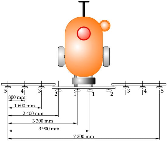 Diffuser spacing on the boom of an over-row sprayer with a secondary air blower (SAB); 1–5—diffuser numbers.