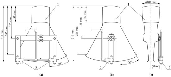 Configuration and basic dimensions of diffusers on the boom of an over-row sprayer with a secondary air blower (SAB): (a) each diffuser is connected to two nozzles; (b) each diffuser is connected to one nozzle; (c) side view (1—diffuser; 2—nozzle).