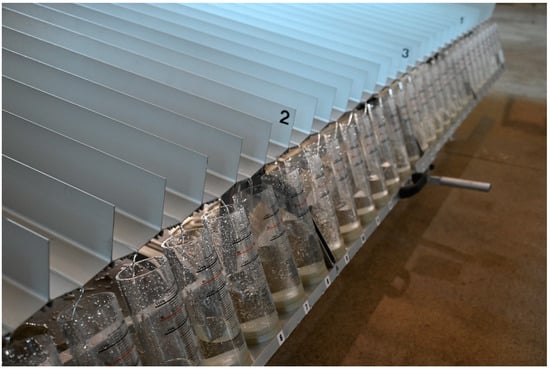 In the second stage of the experiment, the horizontal distribution of the spray liquid was analyzed in configurations that differed by the type of spray nozzle, the number of nozzles, and the nozzle position relative to the diffusers’ axes of symmetry. These measurements were conducted using a portable patternator (BBtechnika, Dzierzążenko, Poland). The patternator had a length of 3.1 m and a width of 1.5 m, and the gutter width was 10 cm. The liquid flowing in each gutter was collected into 500 mL measuring cylinders (Figure 4) with 10 mL graduations. The experimental factors were as follows.