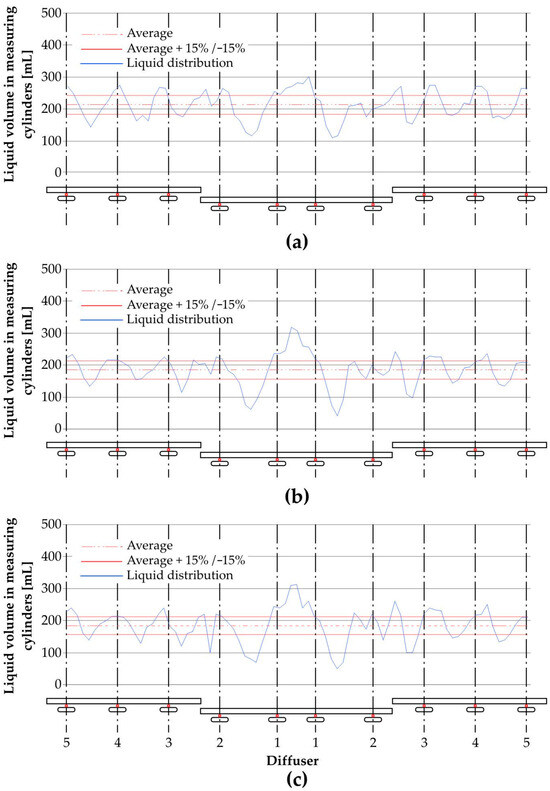 The effects of the interactions between the nozzle and diffuser settings were analyzed in the next step of the study by positioning the diffusers at a height of 50 cm above the patternator. The horizontal distribution of the liquid broadcast by the flat-fan nozzles is presented in Figure 6. The greatest peak-to-peak deviations from the mean values were observed in the proximity of the first two diffusers, positioned closest to the sprayer’s axis of symmetry. The spray rate was highest around the sprayer’s axis of symmetry where the diffusers and the corresponding nozzles were spaced 60 cm apart. The lowest was between the second and the third diffuser, i.e., in the segment of the boom where the nozzles and diffusers were spaced 90 cm apart. In these cases, the auxiliary air stream intensified the described effect by increasing the amount of spray liquid in the central part of the boom and decreasing the amount of spray liquid between the second and the third diffusers. Therefore, it could be assumed that the spray coverage was more uniform when the diffusers and nozzles were spaced 80 cm rather than 60 cm or 90 cm apart.
