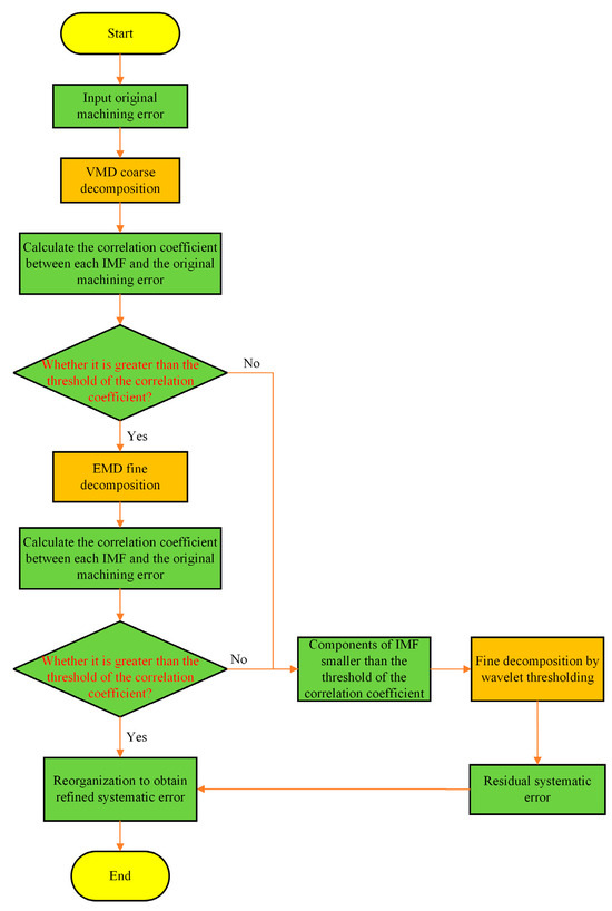 The IMF components’ correlation coefficients between the two processes, VMD coarse decomposition and EMD fine decomposition, and the original machining error are less than the thresholding value of the correlation coefficient set. They are reconstructed and decomposed using the wavelet thresholding method to obtain the systematic error X3 contained therein.