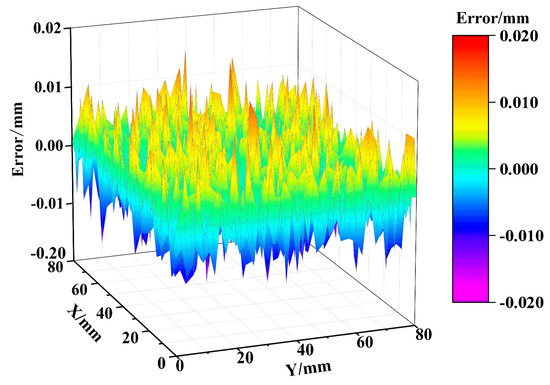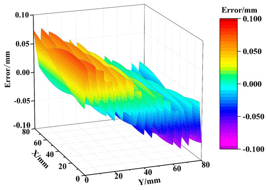 According to the coordinate data of each measurement point obtained from the on-machine measurement, the original machining error of the free-form surface part was calculated, as shown in Figure 11.