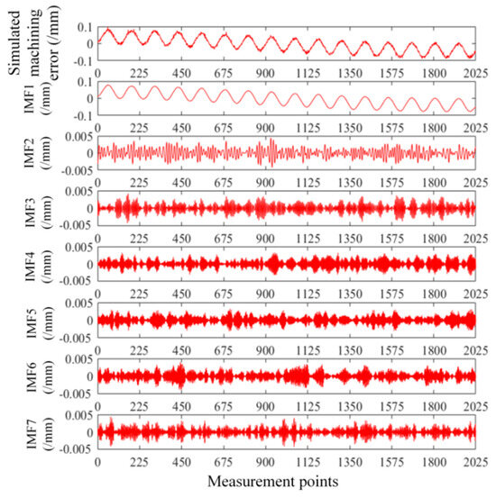First, the VMD algorithm was utilized for coarse decomposition of the original machining error, and the number of decomposition layers K was set to 7 according to the instantaneous frequency mean method. The decomposition results are shown in Figure 12.