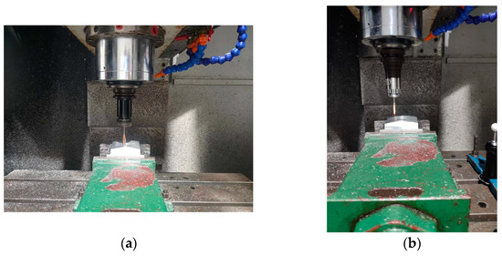 To verify the error compensation effect of the method proposed in this paper in the actual free-form surface machining process, an experiment on the machining of a free-form surface part was designed. On-machine inspection has been widely used in the manufacture of high-precision free-form surfaces or the machining of thin-walled parts because it does not require secondary clamping of the part and therefore does not introduce a secondary clamping error and also reduces time and effort [31]. The CNC machine used in the experiment was a VMC650E vertical machining center, and the inspection system was the IRP40.02 on-machine inspection system produced by Hexagon, with stylus end unidirectional positioning repeatability up to 0.0005 mm. First, the blank was cut, and, after semifinishing, the tool was removed, and the contact probe was installed. Generally, the greater the number is of measurement points on the free-form surface, the greater the reconstruction accuracy when reconstructing the machined surface [32]. The machining error after semifinishing, the original machining error, was obtained using on-machine measurements of the preset 2025 measurement points. The CNC machining process and the on-machine measurement process are shown in Figure 10.