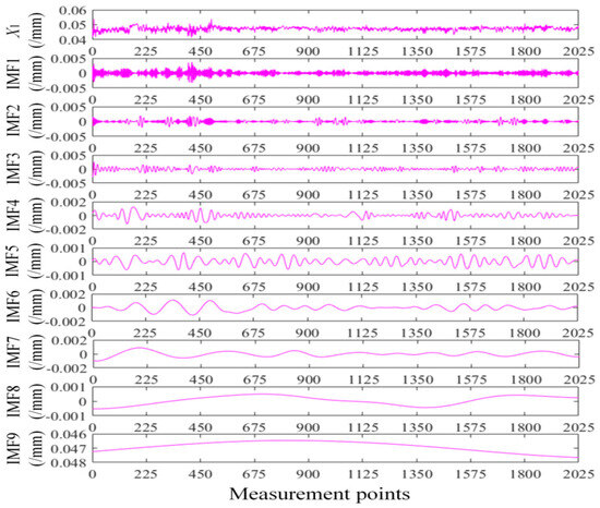 The correlation coefficients between each IMF component in Figure 12 and the original machining error were calculated separately, and the corresponding correlation coefficients for each IMF component are shown in Table 4. The correlation coefficient thresholding was set to 0.3, and the corresponding correlation coefficients of each component were compared with the set thresholding to filter out the eligible IMF components, which were the IMF components containing systematic errors. As shown in Table 4, the components IMF1, IMF2, IMF4 and IMF7 met the screening conditions, which proves that they contained systematic errors, which were reorganized to obtain the coarse systematic error X1.