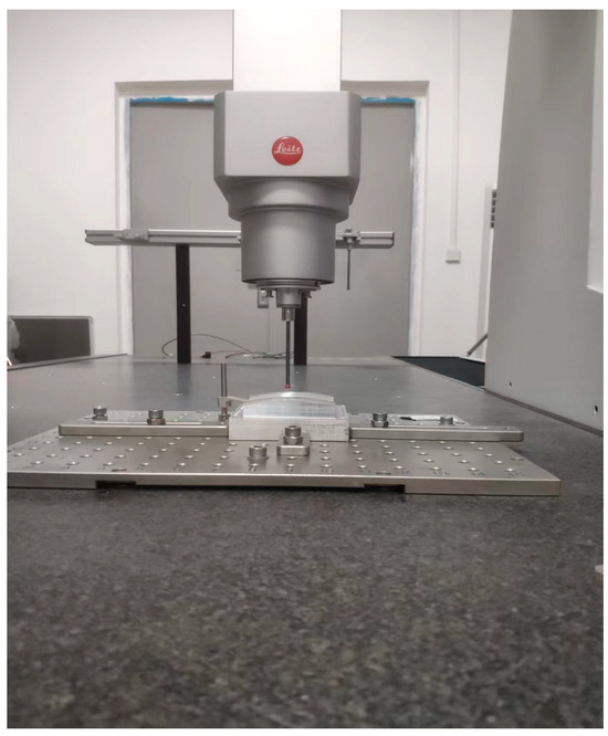 To verify the accuracy of the data obtained through on-machine measurement in this experiment, the machined free-form surface part was moved to a Hexagon (Hexagon manufacturing intelligence, Weinheim, Germany) ultrahigh-precision Leitz Reference HP CMM (PC-DMIS 2019 software, MPEE = 0.9 + L/400 μm) for the performance of the verification experiments, as shown in Figure 16.