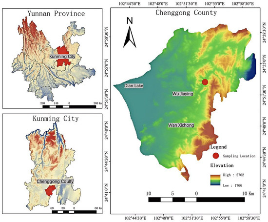 The study area is located in the southwestern corner of Songmao Reservoir, Laoya Mountain, Chenggong District, Kunming City, Yunnan Province, China (Figure 1). Songmao Reservoir, built in 1958, is situated in the upper reaches of the Laoyu River in the Chenggong District of Kunming City, Yunnan Province. The normal reservoir capacity is 10.9 million cubic meters, with a catchment area of 38 square kilometers. The annual average precipitation is over 1000 mm. This area belongs to the subtropical highland monsoon climate. The reservoir water surface is at an altitude of 2016.75 m, surrounded by mountains and dense forests, making it a typical red soil region. The research area is situated approximately 10 km east of Dianchi Lake, in the hilly region on the outskirts of the Kunming Basin. The area features small elevation differences and slopes, well-developed gullies, and relatively well-preserved but variably thick weathering crusts. In this region, extensive and deep regional ancient soils known as Mountain Red Earth are widely distributed across the Yunnan Guizhou Plateau, primarily concentrated in the eastern part of the Yunnan Plateau. These red soils are generally believed to have begun forming in the late Tertiary period, when a warm and humid environment facilitated a process of desilication and aluminum enrichment in the rocks. This process resulted in the formation of thick, high-aluminum red weathering crusts. Subsequent tectonic movements intermittently uplifted the plateau, further promoting the development of Mountain Red Earth [33]. The vegetation in the region predominantly comprises subtropical evergreen broad-leaved forests, mainly consisting of artificially planted Yunnan pine and Chinese fir. The vertical structure of the plant communities is relatively straightforward. However, in recent years, the Laoyu River basin has faced severe erosion of Mountain Red Earth due to natural factors and human activities. This has resulted in adverse vegetation retrogression in parts of the study area, making it challenging for vegetation to establish and grow. Urgent measures such as tree planting, grass seeding, and vegetation restoration are crucial to address these ecological challenges.
