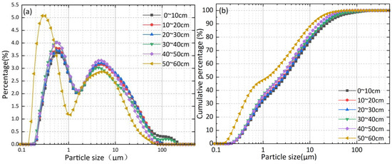 The curves of particle size frequency distribution (a) and accumulation percentage (b).