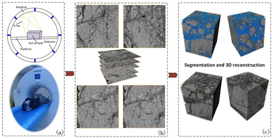 CT scanning and CT data processing, including schematic and field view of CT scanning (a), original images of CT slices (b), and segmentation and 3D reconstruction of soil sample (c).