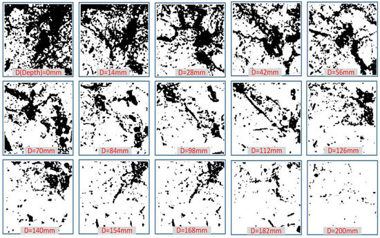 In this scanning, the distance between slices was 0.7 mm, resulting in a total of 290 CT slices for the soil column. For convenience in calculations and research, one slice was selected every five slices, leading to a total spacing of 3.5 mm between selected slices. This included the top and bottom surfaces of the study area (at depths of 0 mm, 3.5 mm, 7 mm, …, 196 mm, and 200 mm), resulting in a total of 58 slices for processing and analysis. Figure 5 presents 20 typical binary images of slices used in this study. From the images, it is visually apparent that the trend of pore area and pore quantity changes with depth, showing a decrease in both the number and area of pores as depth increases. Consequently, the vertical and horizontal pathways of soil pores also decrease. Further quantitative characterization requires statistical analysis of the pore’s feature parameters to gain a deeper understanding of these changes.