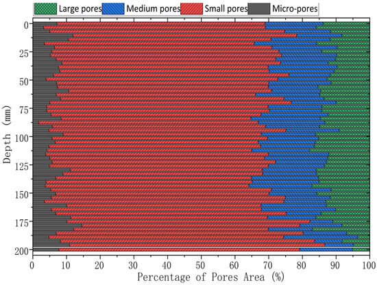 Within the depth of 1 mm to 165.5 mm, the distribution trends of the four types of pores are rather stable. Small pores generally account for the largest proportion, followed by medium and large pores, while micro-pores cover the smallest area. However, overall, the area proportion of large pores is higher than that of both micro-pores and medium pores. This is indicative of the broad distribution of large pores in the surface soil layer, largely due to active biological activity. Within the depth range of 65.5 mm to 200 mm, the proportional distribution of the four types of pores displays a slight shift compared to the patterns observed previously. This is consistent with the pore distribution derived from the CT value extraction (Figure 8). As depth increases, the amount of biological matter decreases along with the distribution of root systems. This results in a reduction of structural pores associated with biological activity. Sudden changes in pore area observed at some locations can be attributed to the decay of roots or the slanting intrusion and extension of roots from the exterior of the soil column under study.