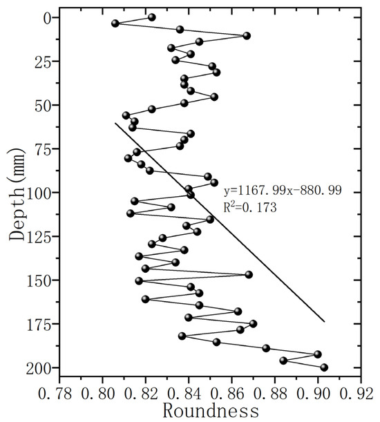 Roundness in soil can serve as an indicator for assessing soil texture and particle structure. Higher roundness typically signifies more homogeneous soil particles with more regular shapes. Such soil exhibits superior water permeability and aeration, and it can retain moisture and nutrients more effectively, thereby facilitating root system development and growth in slope vegetation. Considering the earlier discussion on the trends in pore quantity and area, we find that the roundness at the top of the soil column is lower compared to that near the bottom. This can be attributed to the number and diameter of pores distributed at these depths. The top area contains a larger proportion of medium and large pores, which are less spherical, resulting in lower roundness. However, as depth increases, the pores gradually transition to smaller scales, with both their number and area decreasing. As a result, their shapes become more spherical, leading to a higher roundness.