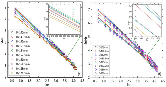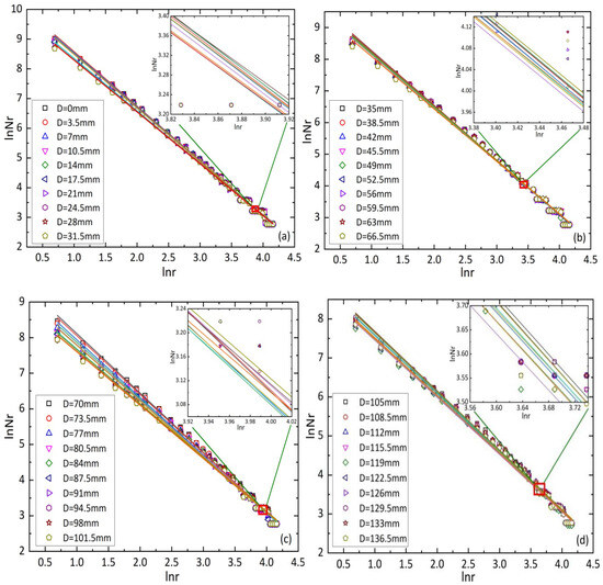 Linear fitting plots of lnr and lnNr for box-counting dimension calculation.
