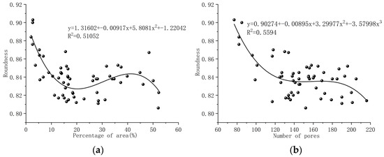 The relationship between the roundness rate and the percentage of pore area (a) and the number of pores (b).