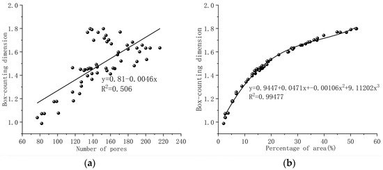 The relationship between the box-counting dimension and the number of pores (a) and the percentage of pore area (b).