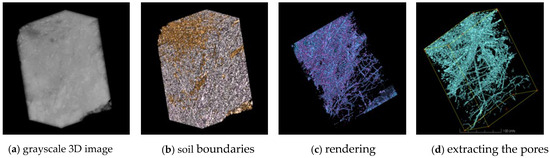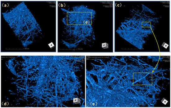 Avizo software (v2022.2) is widely used for 3D visualization and reconstruction based on CT scan data. It effectively partitions components and quantifies geological properties like porosity and permeability, making it popular in geology [46]. Figure 15 illustrates the 3D reconstruction of Mountainous Red Earth, involving stages such as image preprocessing, pore separation, and rendering. CT slice data are superimposed to create a grayscale 3D image (Figure 15a), with soil boundaries marked (Figure 15b). By extracting and rendering the pores (Figure 15c,d), their spatial distribution, connectivity, and curvature are clearly represented.