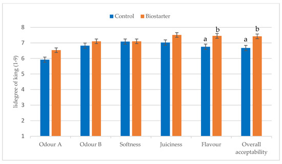 Comparison of sensory liking (40 consumers) control and biostarter samples after 21 days of dry aging. Odor A—raw material (after 21 days of dry-aging; before heat treatment), Odor B—after heat treatment. Different letters (a, b) indicate means that are significantly different at the level of p < 0.05.