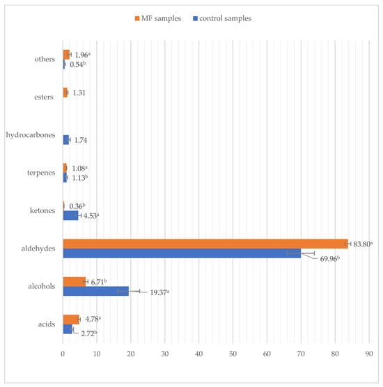 Volatile aroma compound groups [%] found in dry-aged beef samples with biostarter (M. Flavus) and without it (control beef samples) over 21 days. a.b—values within a bar of a specific compound group with different letters are significantly different (p ≤ 0.05).