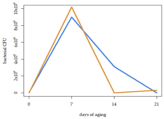 The bacterial growth (as a CFU number) was tested over 21 days of dry-aging (at the start—0 days—and then once per week, throughout the experiment) in order to describe how the presence of fungal strains can affect bacterial development on DAB. No significant differences between the samples inoculated with the fungal biostarter and the control were observed after 21 d of seasoning (Figure 3). The highest overall number of CFUs (10,200,000 units per sample) was observed in both cases after 7 days of aging, and then it started to decrease. However, the drop in the bacteria colonies counts was more explicit and faster in the biostarter-aged samples compared to the control ones.