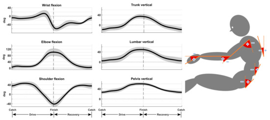 For most of the drive phase, the wrist showed little change in flexion, remaining on average between 11° extension and 12° flexion, until right before the finish (Figure 2). Then, there was a sudden change to a 55° extension, with a gradual return to zero during the recovery phase. Arms were kept extended in the first half of the drive, with the elbow flexion between 7° and 13°. Then, the rowers quickly increased the elbow flexion angle, reaching the peak at the finish, which was 100° on average. During the recovery phase, the elbow extended back to the starting position. During the first half of the drive, shoulder flexion slightly increased from 35° to 46°. In the second half of the drive phase, the shoulders started to extend rapidly with the elbow flexion and reached a maximum extension of 41° on average at the finish. During the recovery phase, the shoulders rapidly reached the flexion value observed at catch, which was then held for the last part of the recovery phase. At the catch, the thoracic segment was found on average to lean 17° towards the front while the lumbar and pelvis segments leaned 4° and 26° towards the back, respectively. In the first half of the drive phase, all three segments moved toward the back. In the second half of the drive, the backward movement of the three segments accelerated and reached the maximum angle right before the finish (34°, 49°, and 60° for T6, lumbar, and pelvis, respectively). During the recovery phase, the three segments performed the inverse movement, with the first half at a higher speed and the second half at a lower speed, reaching the minimum value at the catch.