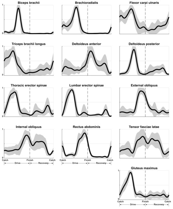 Concerning the muscles of the arms, the first part of the drive phase was dominated by the activations of FCU, TBL and, to a lesser degree, DA and BR (Figure 3). The peak activation for TBL and FCU occurred right before half of the drive phase (34% and 45%, respectively). The second half of the drive phase saw the synergistic action of the BR, BB, and DP reaching their peak activation at 55% of the drive phase, synchronized with the flexion of the elbow and shoulder. The recovery phase started with the peak activation of the DA at 13% of the recovery phase and remained active throughout the entire phase, gradually decreasing in activation until the following catch, where the activation approached zero. Also, DP, TBL, and FCU showed some activation throughout the phase. After the catch, the extensor muscles of the core (i.e., EST, ESL, GM) showed a steep increase in activation, reaching the maximum between 38% and 42% of the drive phase, and then rapidly dropped to almost zero for the rest of the phase. This activity is aligned with the increase in trunk opening speed. The second part of the drive had the activations of the trunk flexors, synchronized to the slowing down of the trunk movement. The trunk flexors peaked in activation between 83% and 90% of the drive phase. Of these, RA and EO showed little to no activation during the recovery phase, except for a short peak in RA activation at catch. IO and TFL were also active throughout the recovery phase, when the trunk was returning forward to the catch position, decreasing their activations until the following catch.