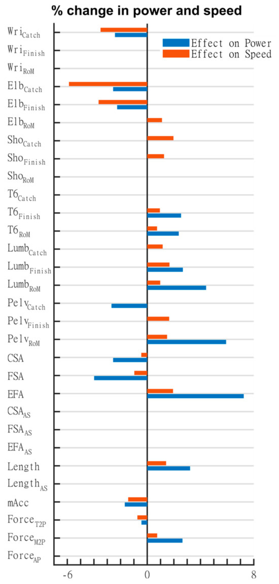 Among the variables describing arm kinematics (Figure 4), reduced ElbCatch and ElbFinish (pointing to a straighter arm at the catch and reduced flexion at the finish) as well as decreased WriCatch were indicative of higher power output and speed. Higher values of ShoCatch and ShoFinish, as well as ElbRoM led to higher speed but not to increased power. The greatest effect was observed for ElbCatch with a 1SD increase in flexion, resulting in a power output change of −2.6% and in change in speed of −5.9%. Regarding the movements of the pelvis and spine segments, PelvRoM was the most important parameter for power production, with increased RoM associated with more power produced (5.9% for 1SD change), and L2Catch was the most important for speed with a 1SD change resulting in a 1.7% change. T6RoM and L2RoM also had positive effects on power and speed. A more forward-tilted pelvis at the catch (lower PelvCatch) was favorable to power but had no impact on speed. A more backward-leaning pelvis at the finish (higher PelvFinish) was beneficial to speed but not to power. Regarding the parameters describing the oar angles, asymmetries had no significant influence (LengthAs, EFAAs, FSAAs and CSAAs) on performance. EFA was the most important parameter to power output and speed (an angle increase of 1SD was associated with 7.2% and 1.9% changes, respectively). Increased CSA and FSA negatively impacted power (−2.6% and −4.0%) and speed (−0.4% and −1%). A less negative peak of boat acceleration mAcc was associated with decreased performance in power and speed (−1.7% and −1.4%). A higher ForceM2P had a positive effect on both power and speed (2.7% and 0.7%). Also, an earlier ForceT2P had a positive effect on both power and speed (0.4% and 0.7%). Finally, there was no significant effect on performance for ForceAP (Figure 4).