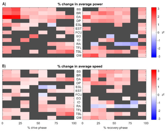 Effect of one standard deviation (1SD) change in the muscle activations on the two measures of performance: power averaged over the rowing cycle (A) and boat speed averaged over the rowing cycle (B). Grey squares indicate no statistical significance (p value > 0.05), while red and blue squares indicate increase and decrease in performance, respectively, with respect to 1SD change in muscle activation. BB: biceps brachii; BR: brachioradialis; DA: deltoideus anterior; DP: deltoideus posterior; FCU: flexor carpi ulnaris; TBL: triceps brachii longus; RA: rectus abdominis; EO: external obliquus; IO: internal obliquus; ESL: lumbar erector spinae; EST: thoracic erector spinae; TFL: tensor fasciae latae; GM: gluteus maximus.