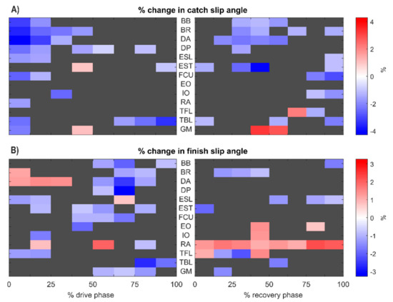 Effect of one standard deviation (1SD) change in the muscle activations on catch slip angle (A) and finish slip angle (B). Grey squares indicate no statistical significance (p value > 0.05), while red and blue squares indicate increase and decrease in performance, respectively, with respect to 1SD change in muscle activation. BB: biceps brachii; BR: brachioradialis; DA: deltoideus anterior; DP: deltoideus posterior; FCU: flexor carpi ulnaris; TBL: triceps brachii longus; RA: rectus abdominis; EO: external obliquus; IO: internal obliquus; ESL: lumbar erector spinae; EST: thoracic erector spinae; TFL: tensor fasciae latae; GM: gluteus maximus.