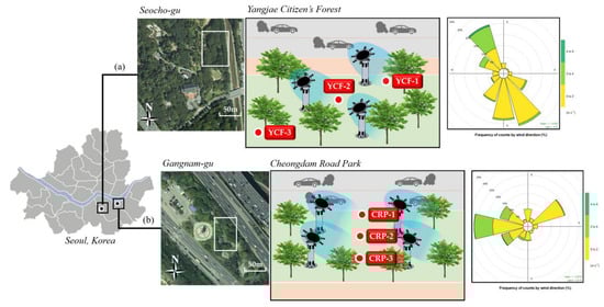 We selected two sites adjacent to the pollutants’ sources of traffic roads in Seoul. Two sites had been implemented to provide the services of urban parks to the people, and deciduous trees of the Occidental Planes (Platanus occidentalis) and Zelkova trees (Zelkova serrata) were planted at two urban parks (YCF and CRP), and based on a preliminary survey for the main direction of the wind rose dataset, we set up the direction of the mist generator at each site, respectively (Figure 2). YCF (37°28′ N, 127°2′ E) is a park built in 1986 to improve the environmental quality around Yangjae Tollgate and has a dense forest (258,991 m2).