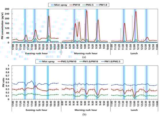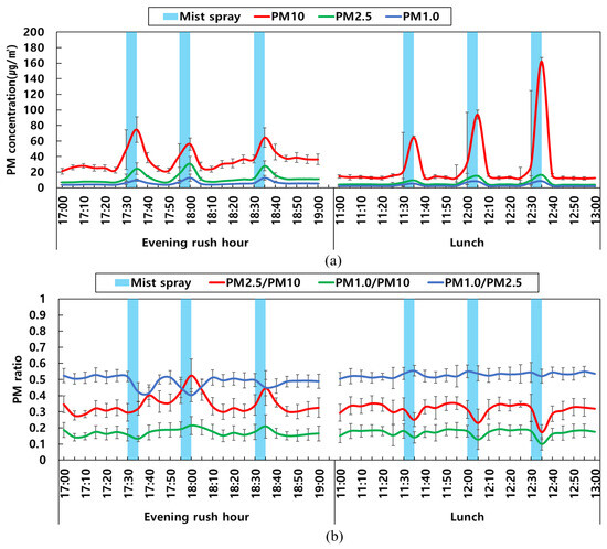 The concentrations of PM10, PM2.5, and PM1.0 at the measuring points increased twice to thrice as soon as mist spraying began (Figure 3a). However, as the spraying ended, the PM concentration immediately decreased and returned to its initial value. The concentration variation of PM10 was lower than that of PM2.5 and PM1.0 in the evening rush hour, whereas the concentration variation of PM10 was large during lunch. However, after the end of spraying, the PM ratio was the same as before (Figure 3b). During the evening rush hour, PM2.5·PM10−1 and PM1.0·PM10−1 increased, and PM1.0·PM2.5−1 decreased as mist was sprayed. In contrast, during lunch, PM2.5·PM10−1, PM1.0·PM10−1, and PM1.0·PM2.5−1 were reduced.