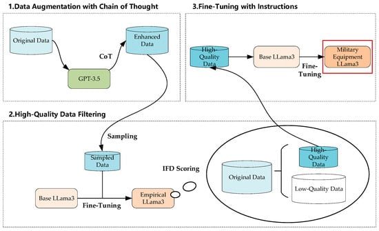 The proposed CoTNER method framework is illustrated in Figure 1. This method consists of three main components: the data augmentation with the chain of thought Module, the high-quality data filtering module, and the fine-tuning with instructions module. Initially, GPT-3.5 is employed to enhance the original data using CoT. Subsequently, the enhanced data are sampled and used to fine-tune the base Llama3 model, resulting in an empirical Llama3 model. Finally, the empirical Llama3 model assesses the difficulty of following instructions in the original data, filtering out high-quality data for fine-tuning the base Llama3 model. This process culminates in the development of a domain-specific large model, the Military Equipment Llama3 model, equipped with knowledge tailored for entity extraction tasks in the military equipment domain.