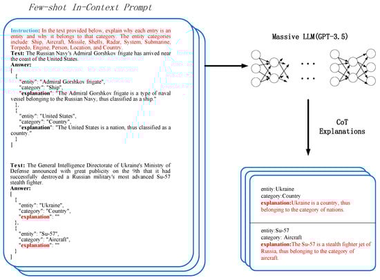 Large-scale language models (LLMs) can capture more complex semantic and contextual information. In this paper, we utilize the GPT-3.5 model with 175 billion parameters. By incorporating chain of thought style explanations based on input text and entity labels into the prompts, interpretative explanations for the extracted results are provided. Below are some examples of annotated data generated by GPT-3.5 with a CoT-style explanation: