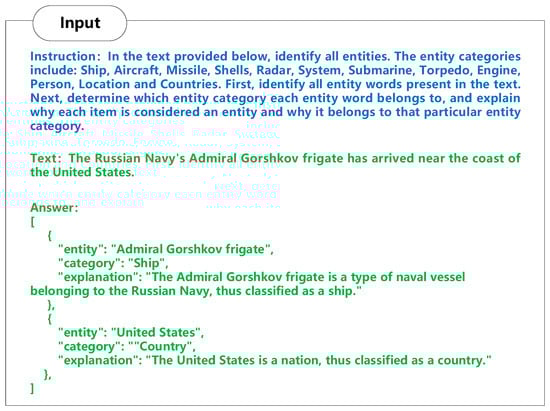 The instruction section provides a task description, which can be further divided into three components: the first sentence specifies the model’s task of extracting entities from text; the second sentence confines the entity category, crucial for military equipment entity extraction tasks, as the natural language meaning of “entity” may encompass categories beyond military equipment; the third sentence instructs the LLM to decompose the problem and solve it step by step, providing an explanation of the extraction results.