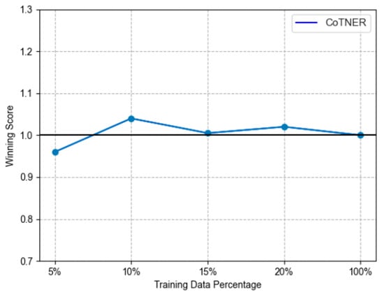 (3) Based on the application of the fine-tuning with instructions module and the data augmentation with the chain of thought module, the model achieved F1 scores of 92.88 and 87.79 on the CoNLL2003 and ACE2005 datasets, respectively, without the high-quality data filtering module. However, after incorporating the high-quality data filtering module, the F1 scores increased to 93.12 and 88.03, respectively. These results demonstrate that the addition of the high-quality data filtering module can further enhance the model’s performance.