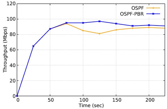 However, with the PBR module enabled, the packet loss rate of QoS flow dropped significantly to , with only a few packets being lost. This improvement was due to the PBR module identifying an alternate open route for the flow, represented by the green links between Host 1 and Host 4. Although the alternate route calculated by the PBR module using Equation (8) has more hops than the OSPF route, it experiences less congestion, resulting in lower delay. These results indicate a substantial performance improvement when OSPF is augmented with the PBR module. Figure 5 shows that the PBR module maintains higher and more stable throughput compared to OSPF under high congestion, owing to the PBR’s ability to find alternative paths with lower end-to-end delay.