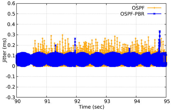 Jitter, an important network performance parameter for real-time communication, is significantly affected by congestion. As shown in Figure 6, the PBR module results in lower jitter compared to OSPF without the PBR module. The reason for this improvement is the reduction in packet loss, which stabilizes jitter, whereas OSPF without PBR suffers from higher variability due to packet drops.