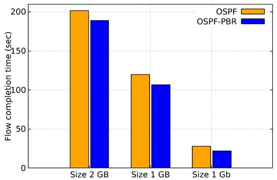 We also examined the effect of the PBR module on the flow completion time QoS flow. Figure 7 presents the flow completion times for OSPF with and without the PBR module for three different QoS flow sizes. The results show that adding the PBR module leads to shorter flow completion times. The improvement is less pronounced for smaller flows, as these flows do not cause significant congestion, resulting in only marginal gains from the PBR module.
