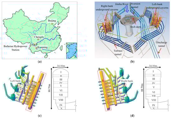 - Shi, A.C.; Li, C.J.; Hong, W.B.; Lu, G.D.; Zhou, J.W.; Li, H.B. Comparative analysis of deformation and failure mechanisms of underground powerhouses on the left and right banks of Baihetan hydropower station. J. Rock Mech. Geotech. Eng. 2022, 14, 731–745. [Google Scholar] [CrossRef]
